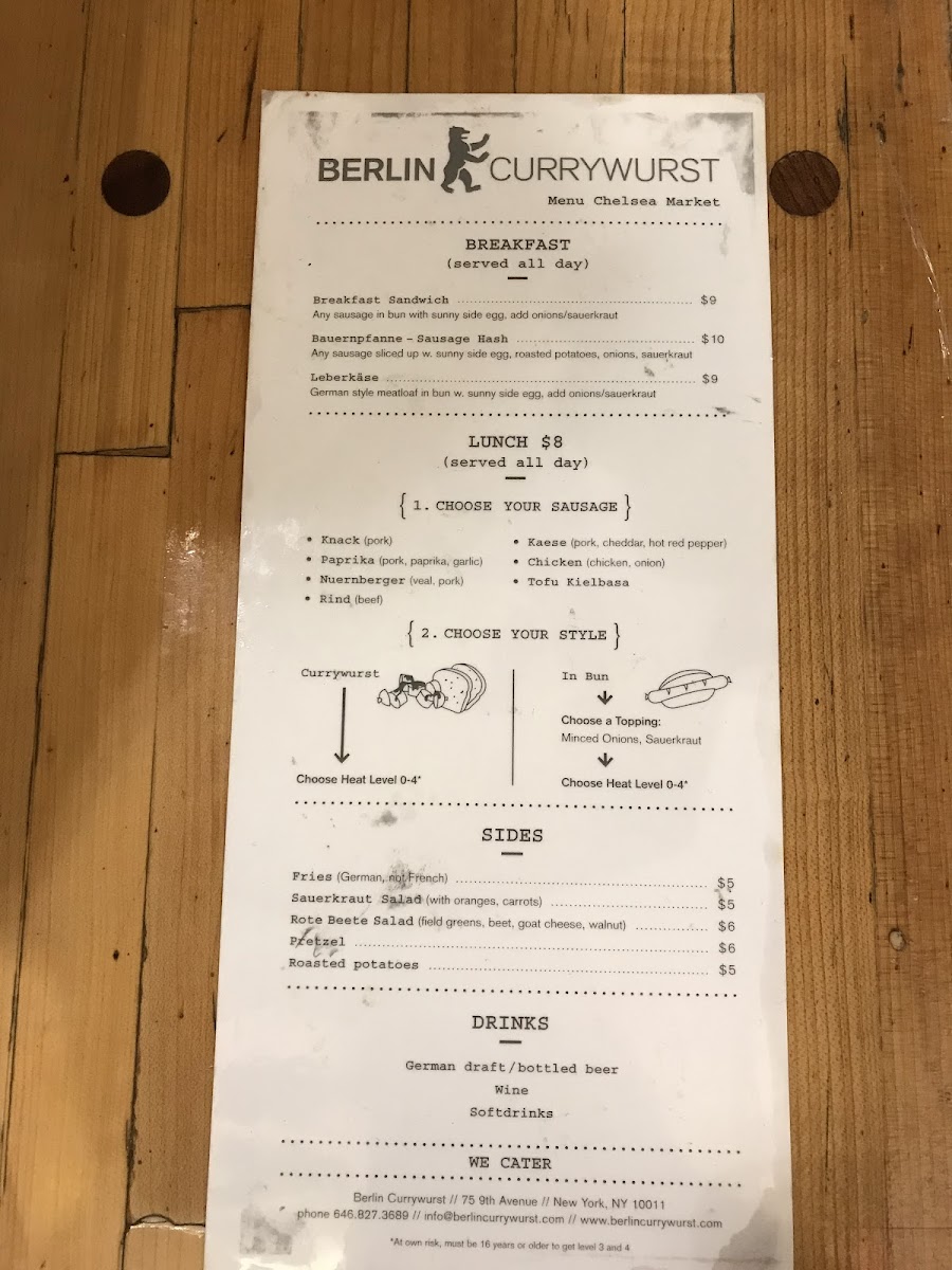 Located in the vibrant Chelsea Market at 75 9th Ave, New York, Berlin Currywurst offers a savory taste of Germany with its distinct menu centered around the iconic currywurst. This casual eatery invites guests to indulge in a variety of sausage options, including a delightful vegetarian tofu kielbasa that has garnered rave reviews.
